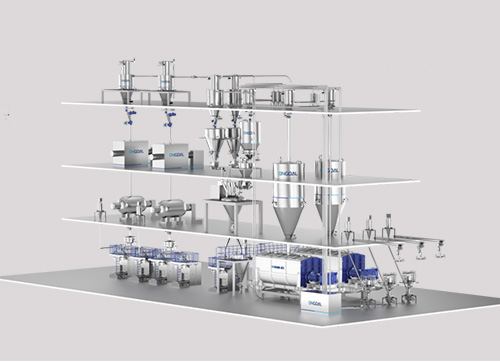 我們從解包投料、儲存破拱、氣力輸送、計量配料到混合攪拌的整個工藝流程,全方位多角度考慮生產的潔凈、便利與安全,為客戶提供一整套食品級原料處理一站式解決方案。